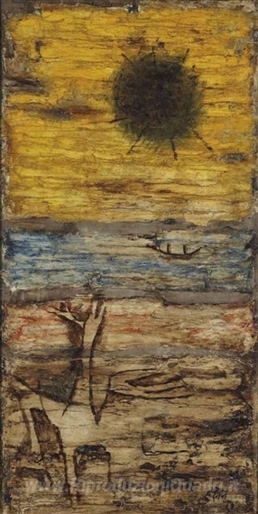 Ti offriamo una riproduzione artigianale su tela dell'opera famosa 'Wasteland' di M.F. Husain, dal Museo delle Riproduzioni.