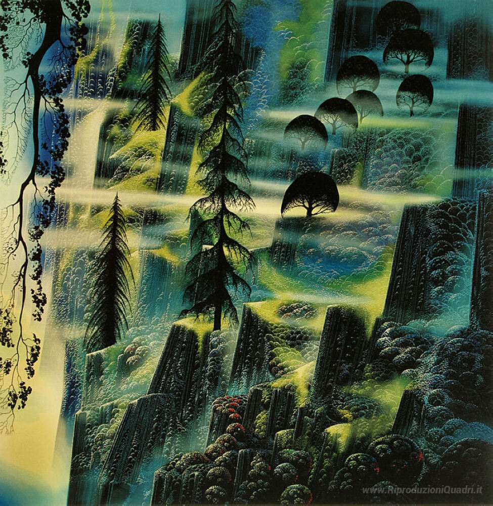Ti offriamo una riproduzione artigianale su tela dell'opera famosa 'Where Eagles Fly' di Eyvind Earle, dal Museo delle Riproduzioni.