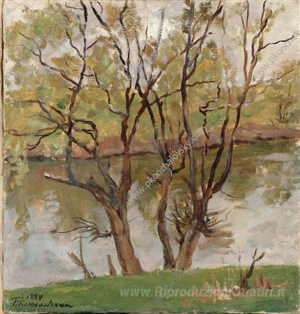Ti offriamo una riproduzione artigianale su tela dell'opera famosa 'Willows sul fiume Protva' di Pyotr Konchalovsky, dal Museo delle Riproduzioni.