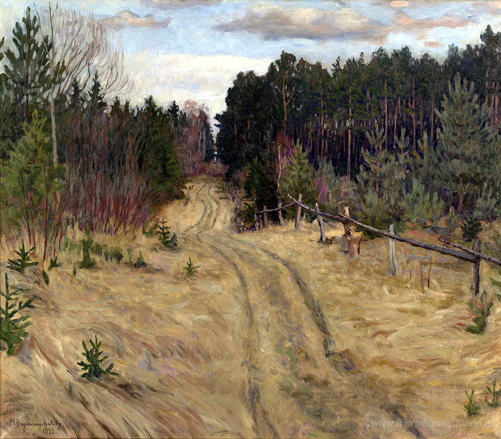 Ti offriamo una riproduzione artigianale su tela dell'opera famosa 'Woodland Path' di Nikolay Bogdanov-Belsky, dal Museo delle Riproduzioni.