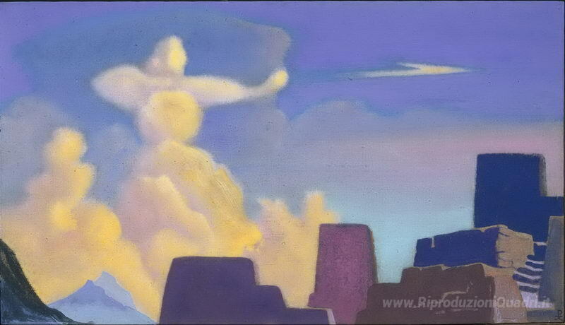 Ti offriamo una riproduzione artigianale su tela dell'opera famosa 'Defender. Cloud-arciere.' di Nicholas Roerich, dal Museo delle Riproduzioni.