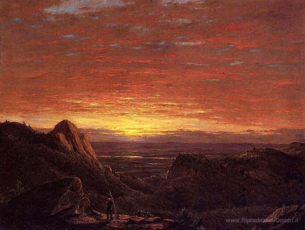 Ti offriamo una riproduzione artigianale su tela dell'opera famosa 'Mattina, guardando ad est verso valle dell'Hudson da Catskill Mo' di Frederic Edwin Church, dal Museo delle Riproduzioni.