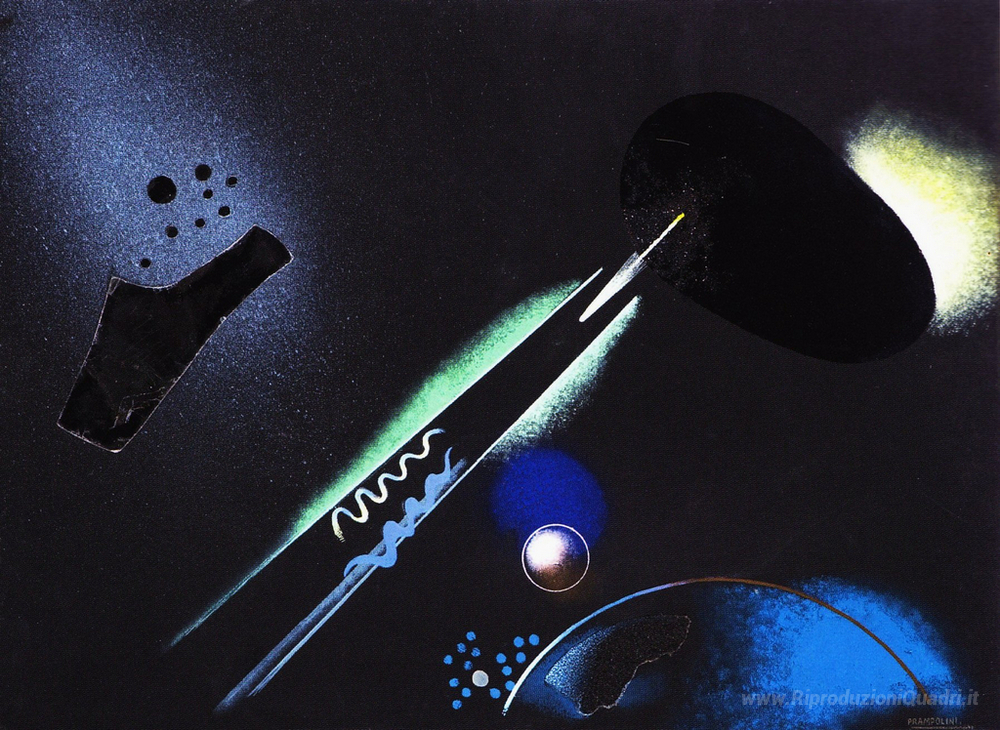 Ti offriamo una riproduzione artigianale su tela dell'opera famosa 'Paesaggio Cosmico 1934' di Enrico Prampolini, dal Museo delle Riproduzioni.