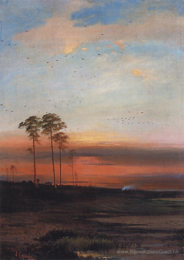 Ti offriamo una riproduzione artigianale su tela dell'opera famosa 'Tramonto' di Aleksey Savrasov, dal Museo delle Riproduzioni.