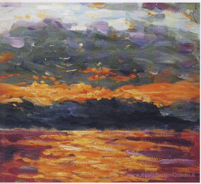 Ti offriamo una riproduzione artigianale su tela dell'opera famosa 'Tramonto sul mare' di Winston Churchill, dal Museo delle Riproduzioni.