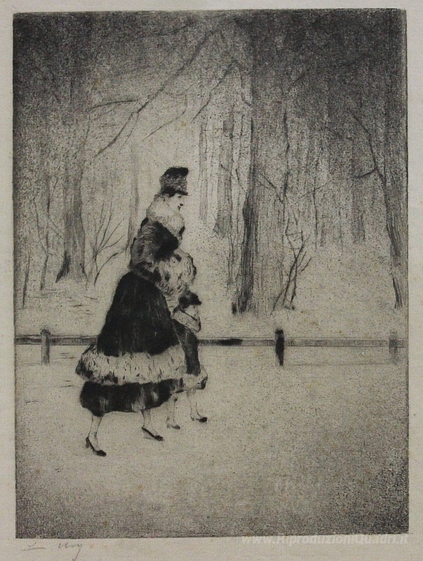 Ti offriamo una riproduzione artigianale su tela dell'opera famosa 'Dame mit Kind im Tiergarten (Berlino)' di Lesser Ury, dal Museo delle Riproduzioni.
