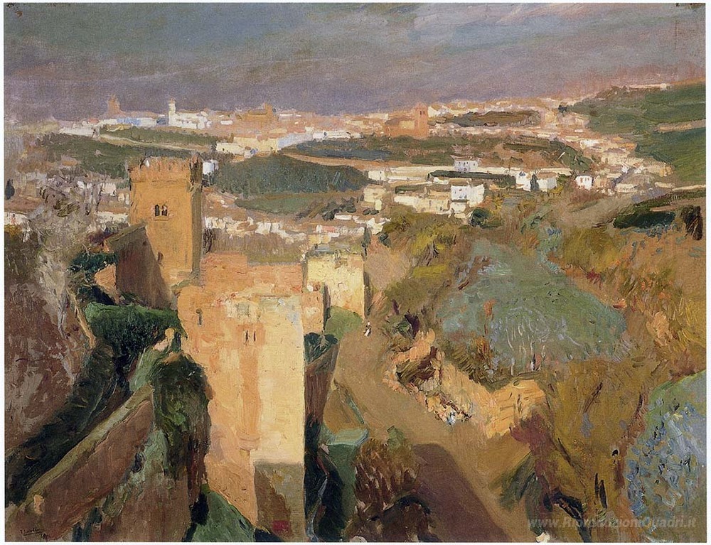 Ti offriamo una riproduzione artigianale su tela dell'opera famosa 'Tower of Seven, pont Alhambra, Granada' di Joaquín Sorolla, dal Museo delle Riproduzioni.
