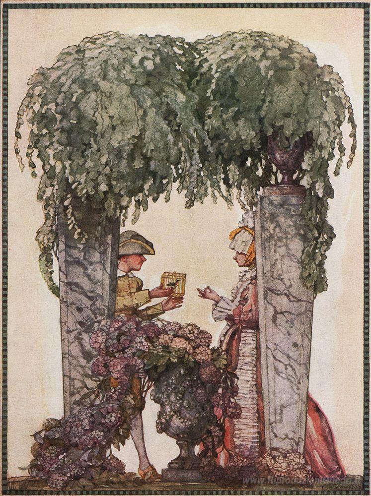 Ti offriamo una riproduzione artigianale su tela dell'opera famosa 'Giardiniere regalo' di Konstantin Somov, dal Museo delle Riproduzioni.