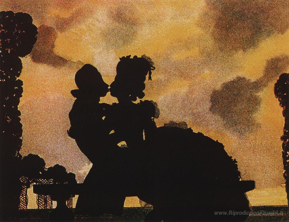Ti offriamo una riproduzione artigianale su tela dell'opera famosa 'Il bacio (Silhouette)' di Konstantin Somov, dal Museo delle Riproduzioni.