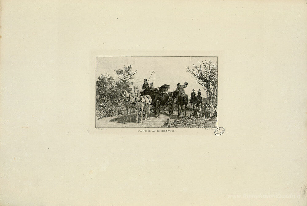 Ti offriamo una riproduzione artigianale su tela dell'opera famosa 'L'arrivée au rendez-vous' di Charles Jacque, dal Museo delle Riproduzioni.