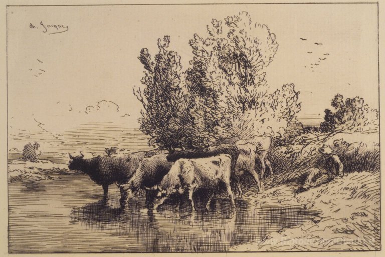 Ti offriamo una riproduzione artigianale su tela dell'opera famosa 'Mucche' di Charles Jacque, dal Museo delle Riproduzioni.