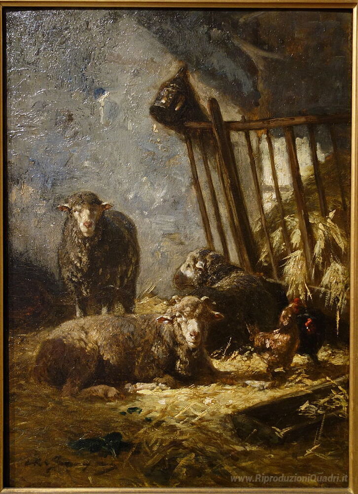 Ti offriamo una riproduzione artigianale su tela dell'opera famosa 'Pecore in Manger' di Charles Jacque, dal Museo delle Riproduzioni.