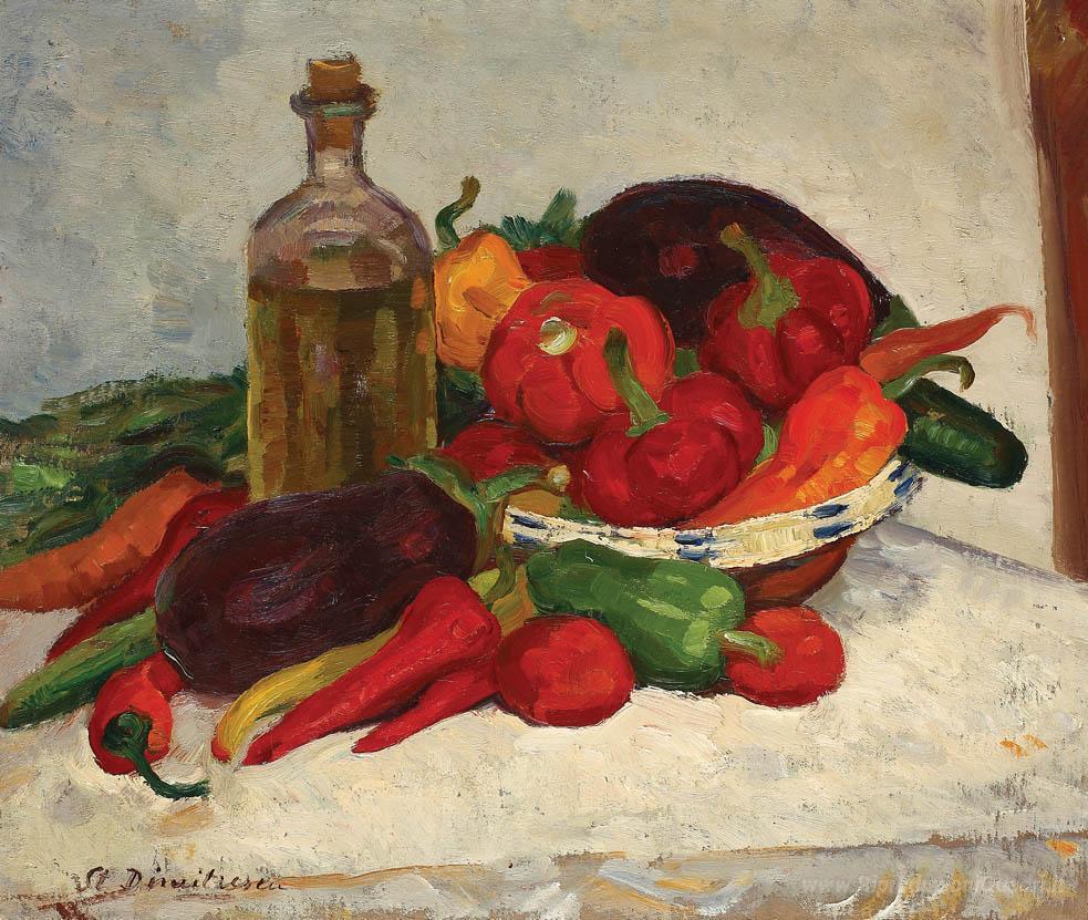 Ti offriamo una riproduzione artigianale su tela dell'opera famosa 'Natura morta con verdure Ripe' di Stefan Dimitrescu, dal Museo delle Riproduzioni.