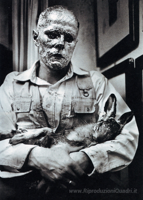 Ti offriamo una riproduzione artigianale su tela dell'opera famosa 'Come spiegare Pictures ad un lepre morta' di Joseph Beuys, dal Museo delle Riproduzioni.