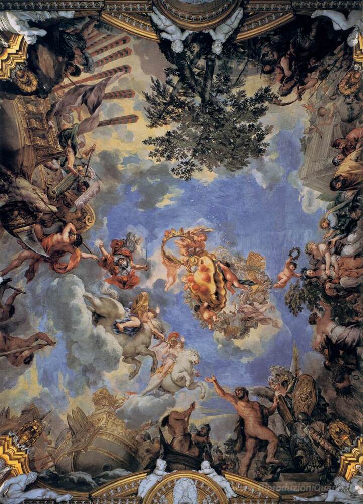 Ti offriamo una riproduzione artigianale su tela dell'opera famosa 'Soffitto Affresco con Medici stemma' di Pietro da Cortona, dal Museo delle Riproduzioni.