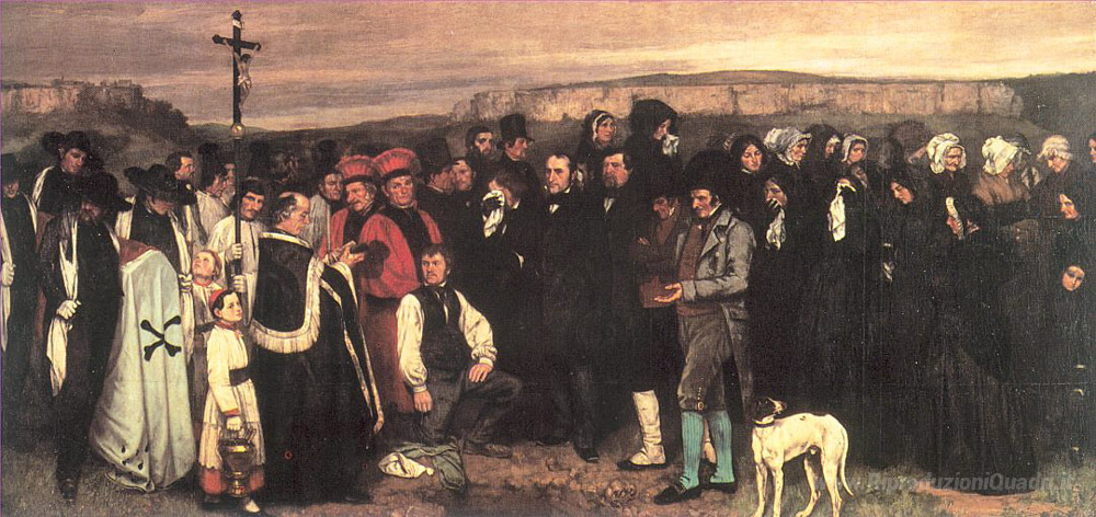 Ti offriamo una riproduzione artigianale su tela dell'opera famosa 'Un funerale a Ornans' di Gustave Courbet, dal Museo delle Riproduzioni.