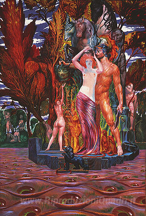 Ti offriamo una riproduzione artigianale su tela dell'opera famosa 'Afrodite e PERSEUS sull'isola di OCCHI (ARCADIA)' di Ernst Fuchs, dal Museo delle Riproduzioni.