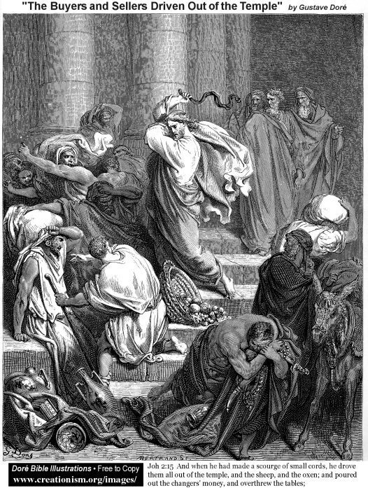 Ti offriamo una riproduzione artigianale su tela dell'opera famosa 'Acquirenti e venditori cacciati dal tempio' di Gustave Dore, dal Museo delle Riproduzioni.