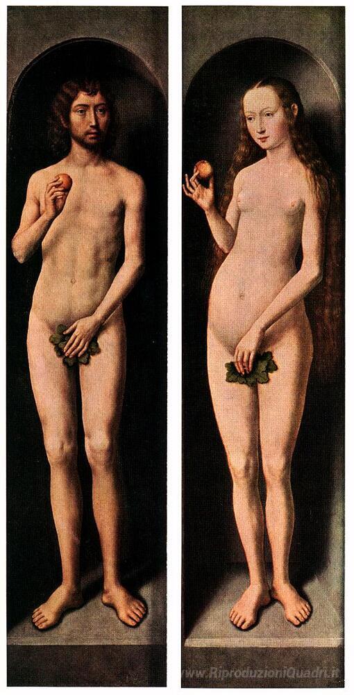 Ti offriamo una riproduzione artigianale su tela dell'opera famosa 'Adam e Eve' di Hans Memling, dal Museo delle Riproduzioni.