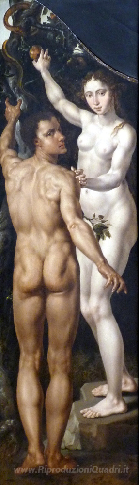 Ti offriamo una riproduzione artigianale su tela dell'opera famosa 'Adam e Eve' di Maerten van Heemskerck, dal Museo delle Riproduzioni.