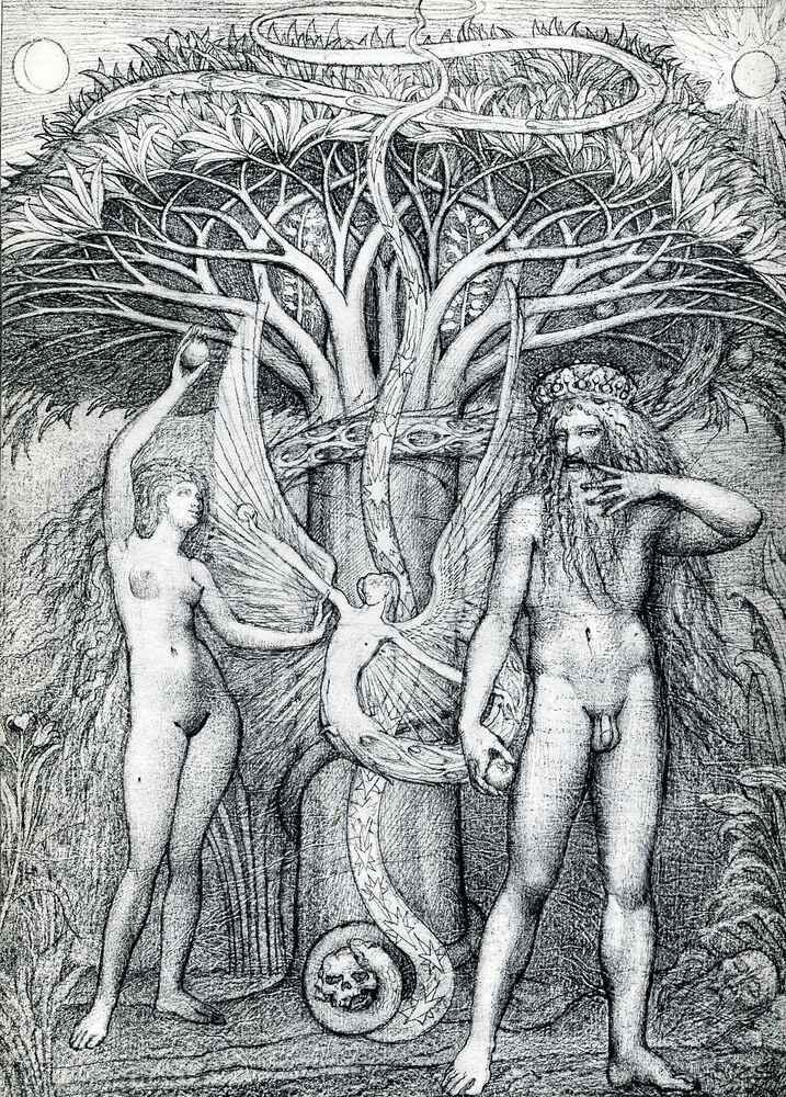 Ti offriamo una riproduzione artigianale su tela dell'opera famosa 'Adamo ed Eva sotto l'albero della conoscenza' di Ernst Fuchs, dal Museo delle Riproduzioni.