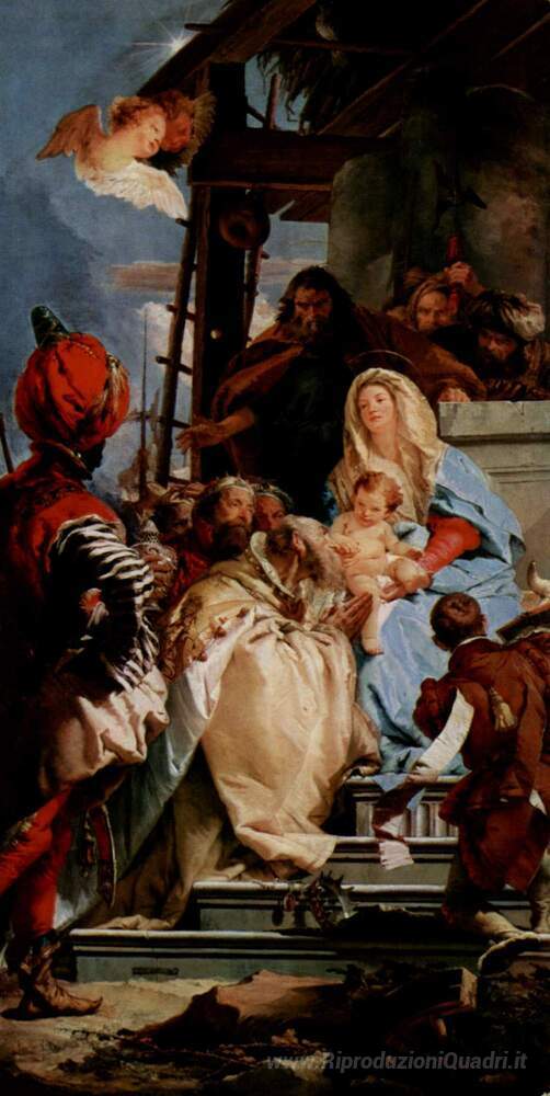 Ti offriamo una riproduzione artigianale su tela dell'opera famosa 'Adorazione dei Magi' di Giovanni Battista Tiepolo, dal Museo delle Riproduzioni.