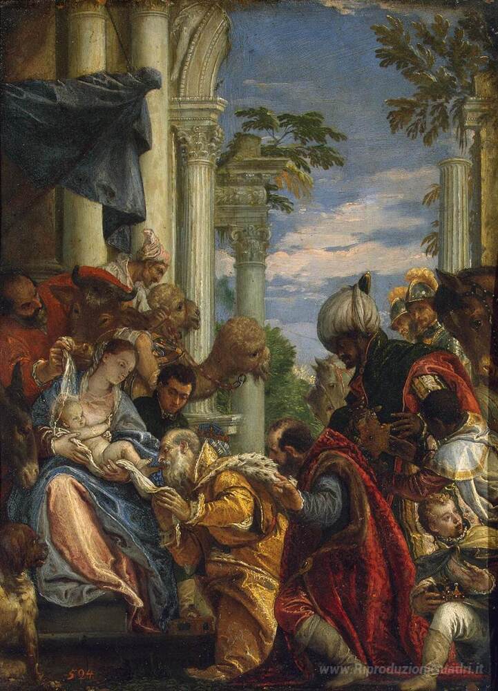 Ti offriamo una riproduzione artigianale su tela dell'opera famosa 'Adorazione dei Magi' di Paolo Veronese, dal Museo delle Riproduzioni.