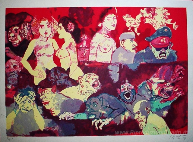 Ti offriamo una riproduzione artigianale su tela dell'opera famosa 'All'inferno' di Carlos Alonso, dal Museo delle Riproduzioni.
