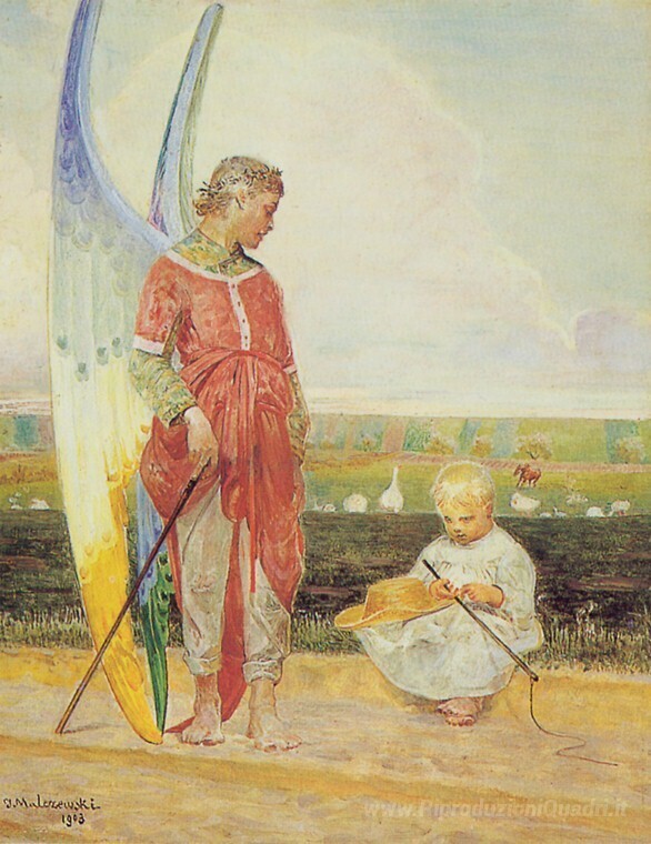 Ti offriamo una riproduzione artigianale su tela dell'opera famosa 'Angelo e il pastorello' di Jacek Malczewski, dal Museo delle Riproduzioni.