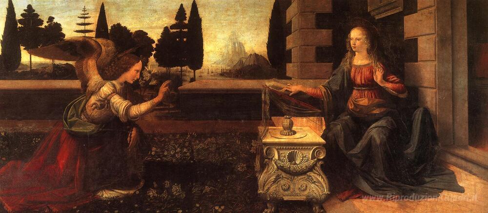 Ti offriamo una riproduzione artigianale su tela dell'opera famosa 'Annunciazione' di Leonardo da Vinci, dal Museo delle Riproduzioni.