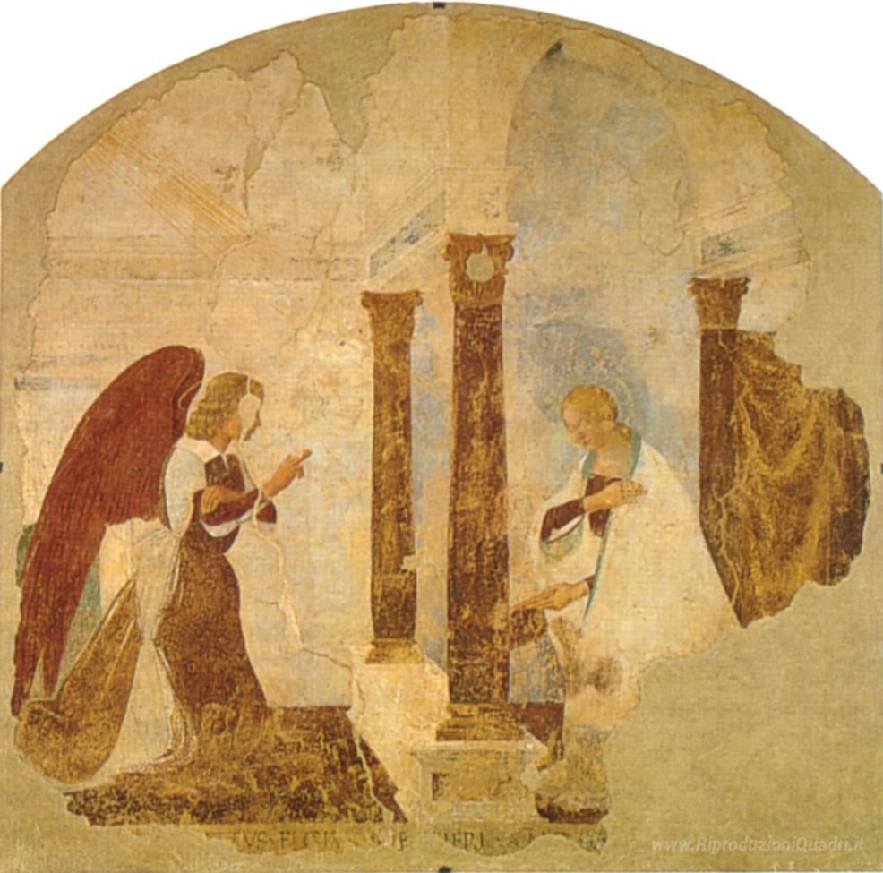 Ti offriamo una riproduzione artigianale su tela dell'opera famosa 'Annunciazione' di Luca Signorelli, dal Museo delle Riproduzioni.