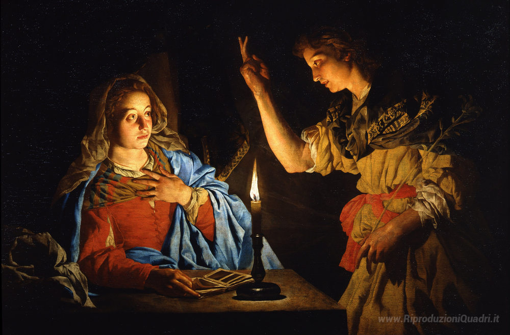 Ti offriamo una riproduzione artigianale su tela dell'opera famosa 'Annunciazione' di Matthias Stom, dal Museo delle Riproduzioni.