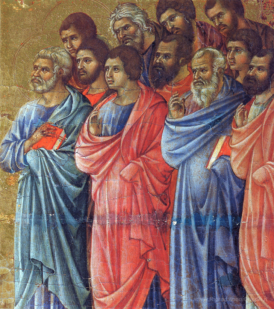 Ti offriamo una riproduzione artigianale su tela dell'opera famosa 'Apparizione di Cristo agli apostoli (frammento)' di Duccio, dal Museo delle Riproduzioni.