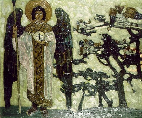 Ti offriamo una riproduzione artigianale su tela dell'opera famosa 'Arcangelo (Studio su "Tesori di angeli")' di Nicholas Roerich, dal Museo delle Riproduzioni.