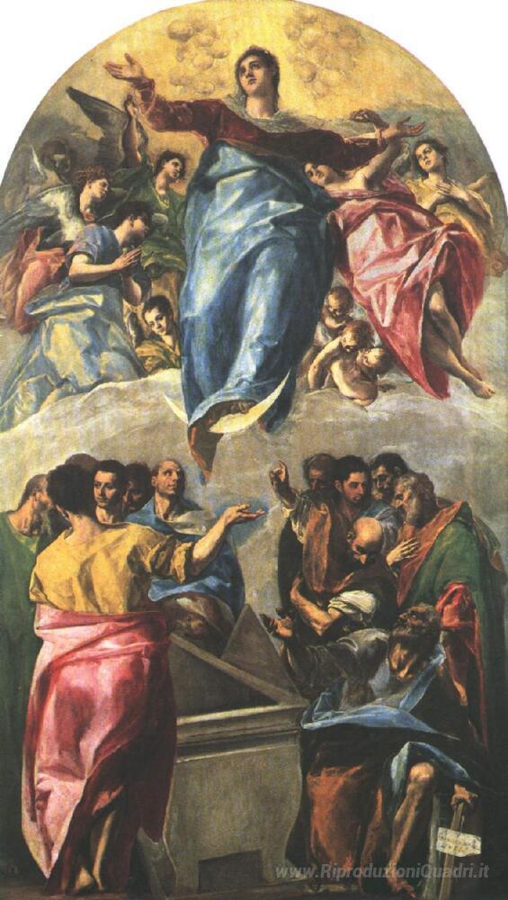 Ti offriamo una riproduzione artigianale su tela dell'opera famosa 'Assunzione della Vergine' di El Greco, dal Museo delle Riproduzioni.