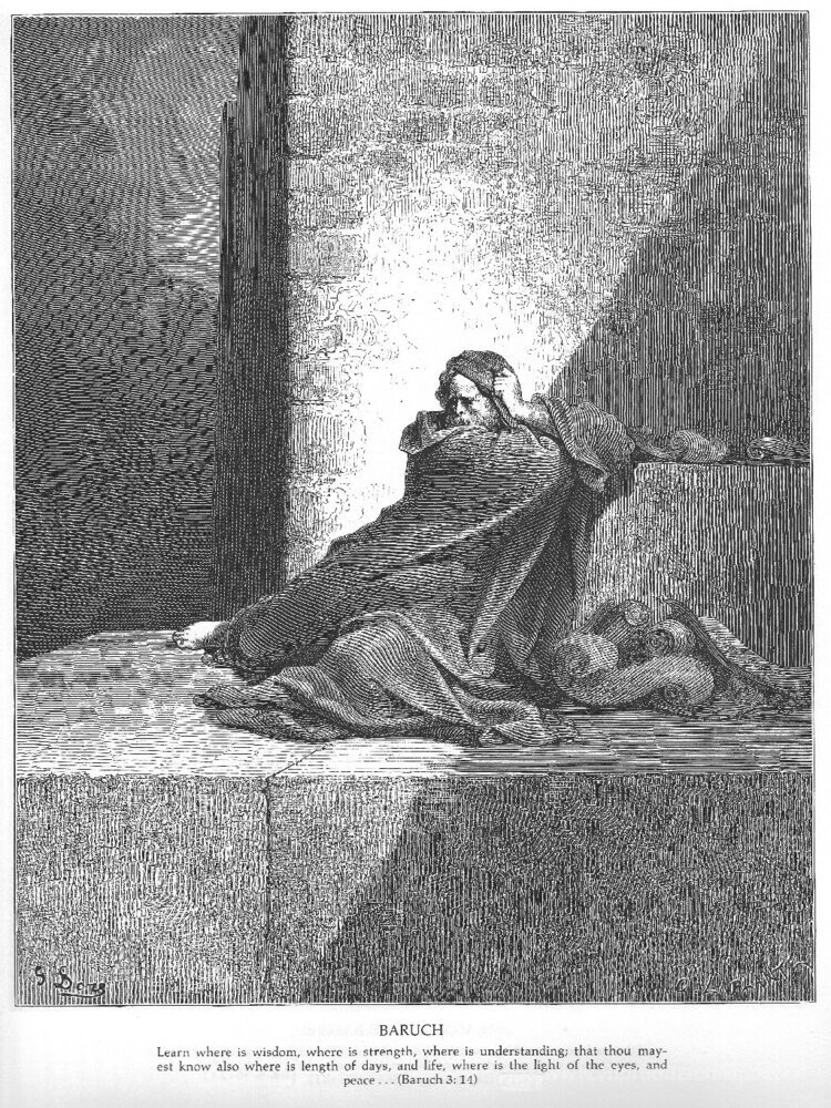 Ti offriamo una riproduzione artigianale su tela dell'opera famosa 'Baruch' di Gustave Dore, dal Museo delle Riproduzioni.