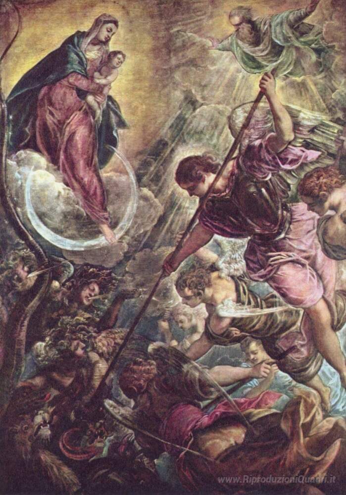 Ti offriamo una riproduzione artigianale su tela dell'opera famosa 'Battaglia di Arcangelo Michele e Satana' di Tintoretto, dal Museo delle Riproduzioni.
