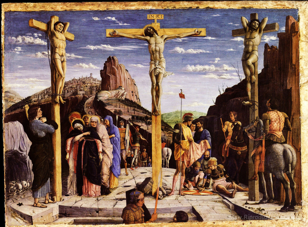 Ti offriamo una riproduzione artigianale su tela dell'opera famosa 'Calvario, pannello predella centrale dal San Zeno di Verona pala' di Andrea Mantegna, dal Museo delle Riproduzioni.