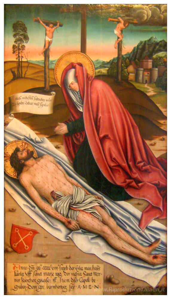 Ti offriamo una riproduzione artigianale su tela dell'opera famosa 'Compianto di Cristo' di Bernhard Strigel, dal Museo delle Riproduzioni.