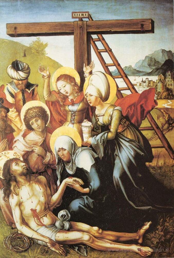 Ti offriamo una riproduzione artigianale su tela dell'opera famosa 'Compianto di Cristo' di Albrecht Durer, dal Museo delle Riproduzioni.