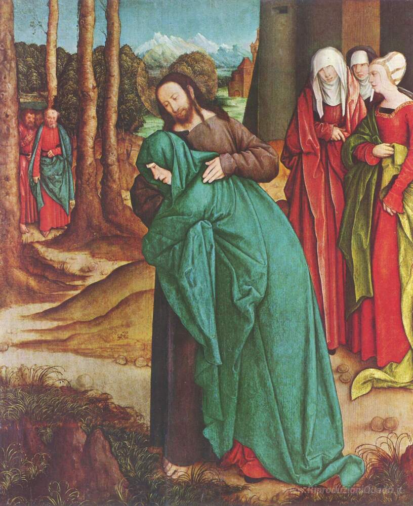 Ti offriamo una riproduzione artigianale su tela dell'opera famosa 'Congedo di Cristo dalla Madre' di Bernhard Strigel, dal Museo delle Riproduzioni.