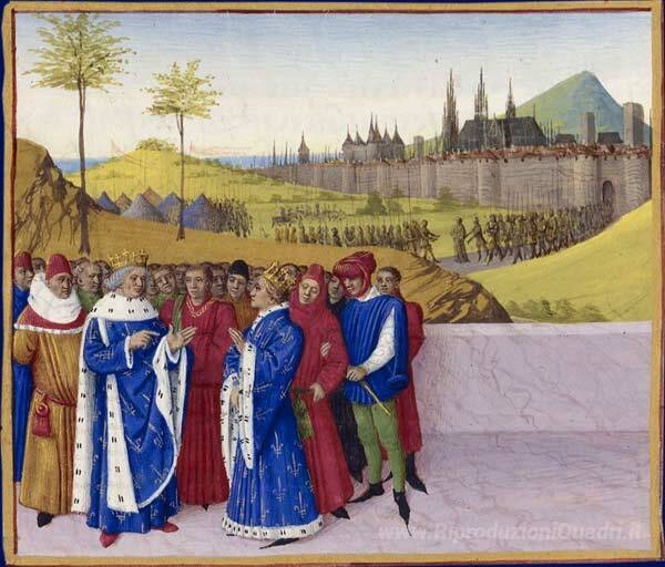Ti offriamo una riproduzione artigianale su tela dell'opera famosa 'Conversazione tra St. Gontran e San Childeberto II' di Jean Fouquet, dal Museo delle Riproduzioni.