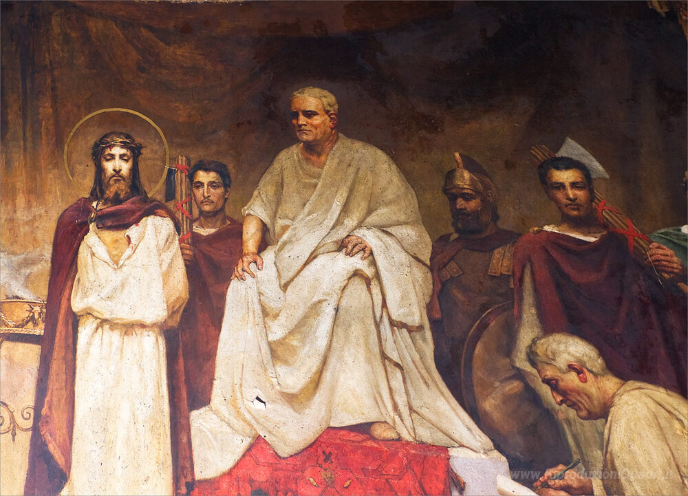 Ti offriamo una riproduzione artigianale su tela dell'opera famosa 'Corte di Pilato' di Wilhelm Kotarbinski, dal Museo delle Riproduzioni.