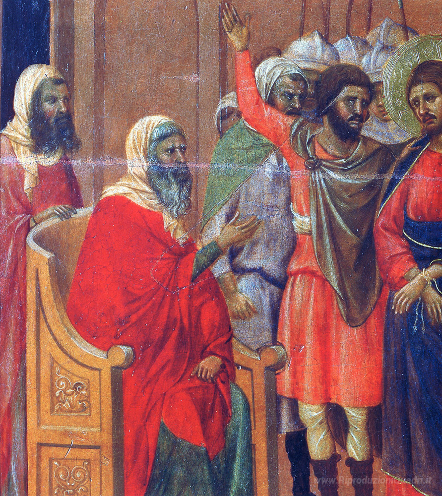Ti offriamo una riproduzione artigianale su tela dell'opera famosa 'Cristo davanti a Anna (frammento)' di Duccio, dal Museo delle Riproduzioni.