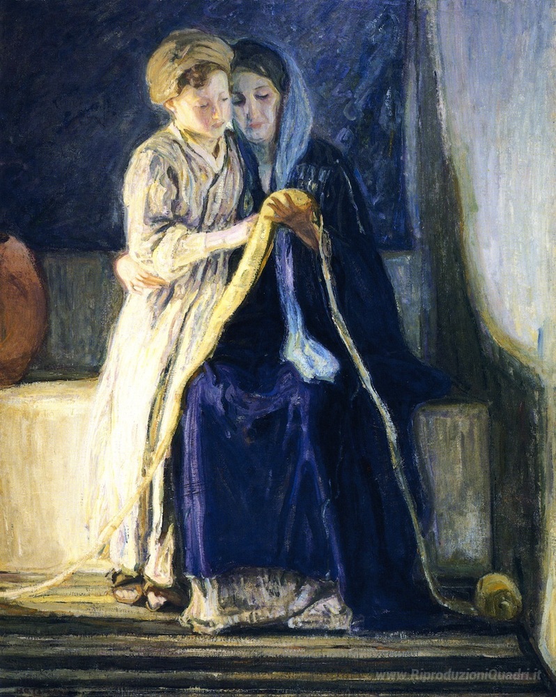 Ti offriamo una riproduzione artigianale su tela dell'opera famosa 'Cristo e la sua Madre Studiare le Scritture' di Henry Ossawa Tanner, dal Museo delle Riproduzioni.