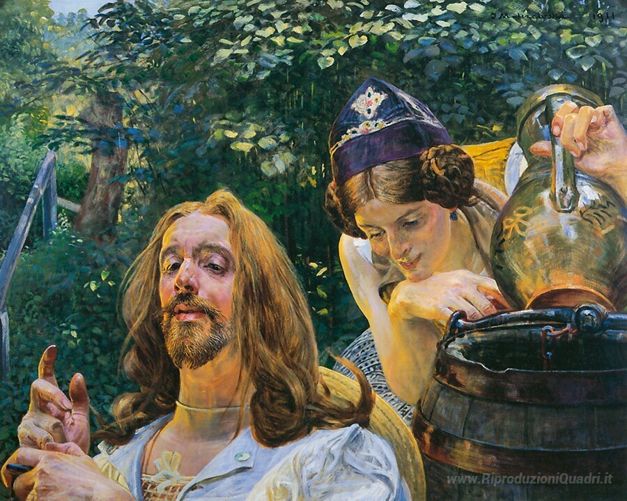 Ti offriamo una riproduzione artigianale su tela dell'opera famosa 'Cristo e Samaritana' di Jacek Malczewski, dal Museo delle Riproduzioni.