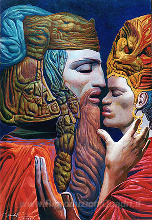 Ti offriamo una riproduzione artigianale su tela dell'opera famosa 'DAVID E BATSHEBAH (IV)' di Ernst Fuchs, dal Museo delle Riproduzioni.