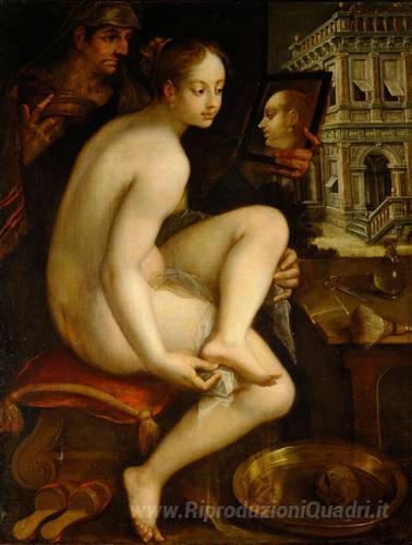 Ti offriamo una riproduzione artigianale su tela dell'opera famosa 'Davide e Betsabea' di Hans von Aachen, dal Museo delle Riproduzioni.