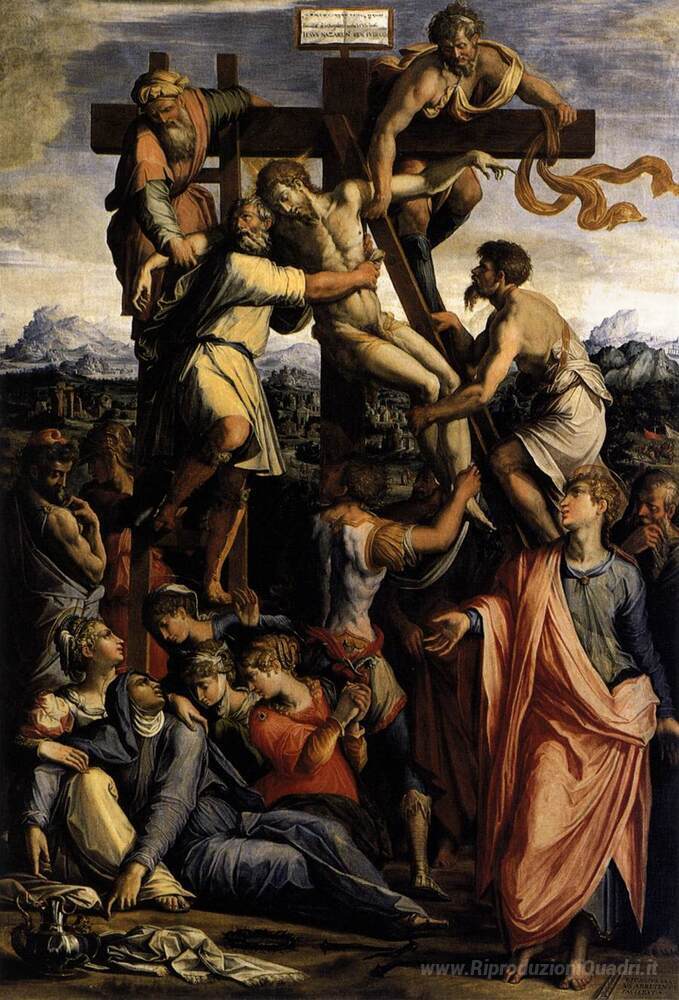 Ti offriamo una riproduzione artigianale su tela dell'opera famosa 'Deposizione dalla Croce' di Giorgio Vasari, dal Museo delle Riproduzioni.