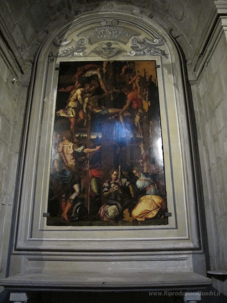 Ti offriamo una riproduzione artigianale su tela dell'opera famosa 'Deposizione dalla Croce' di Giorgio Vasari, dal Museo delle Riproduzioni.